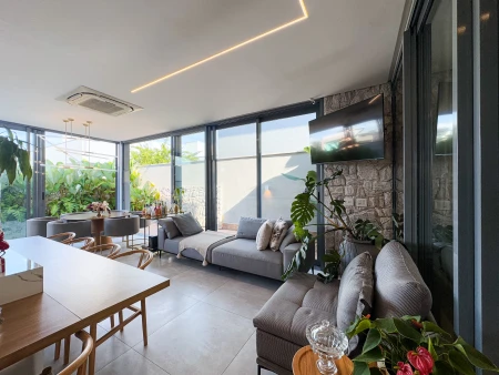 Casa toda integrada, com LED na sala, bancadas em granitos, cozinha no Preto São Gabriel e banheiro bege bahia.