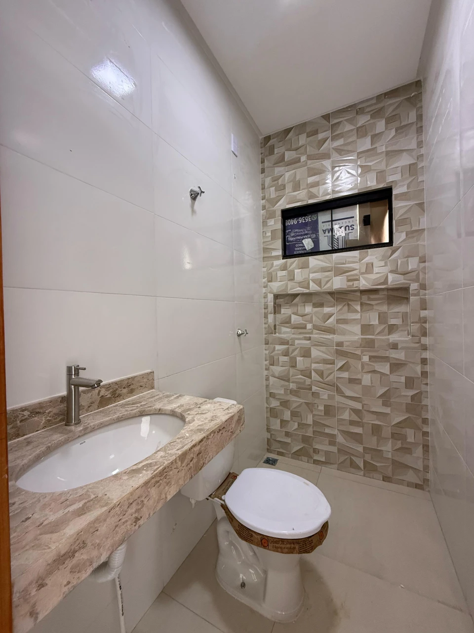 2 vagas de garagem sendo uma coberta, Pé direito alto, toda no porcelanato, roda pé embutido, banheiro com nicho no bege bahia,