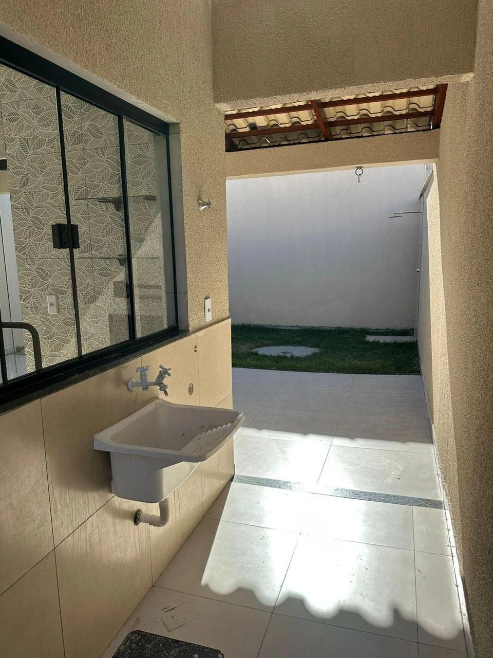 Sala espaçosa com pé-direito alto, Garagem coberta para 2 carros, Ponto preparado para hidromassagem no fundo.