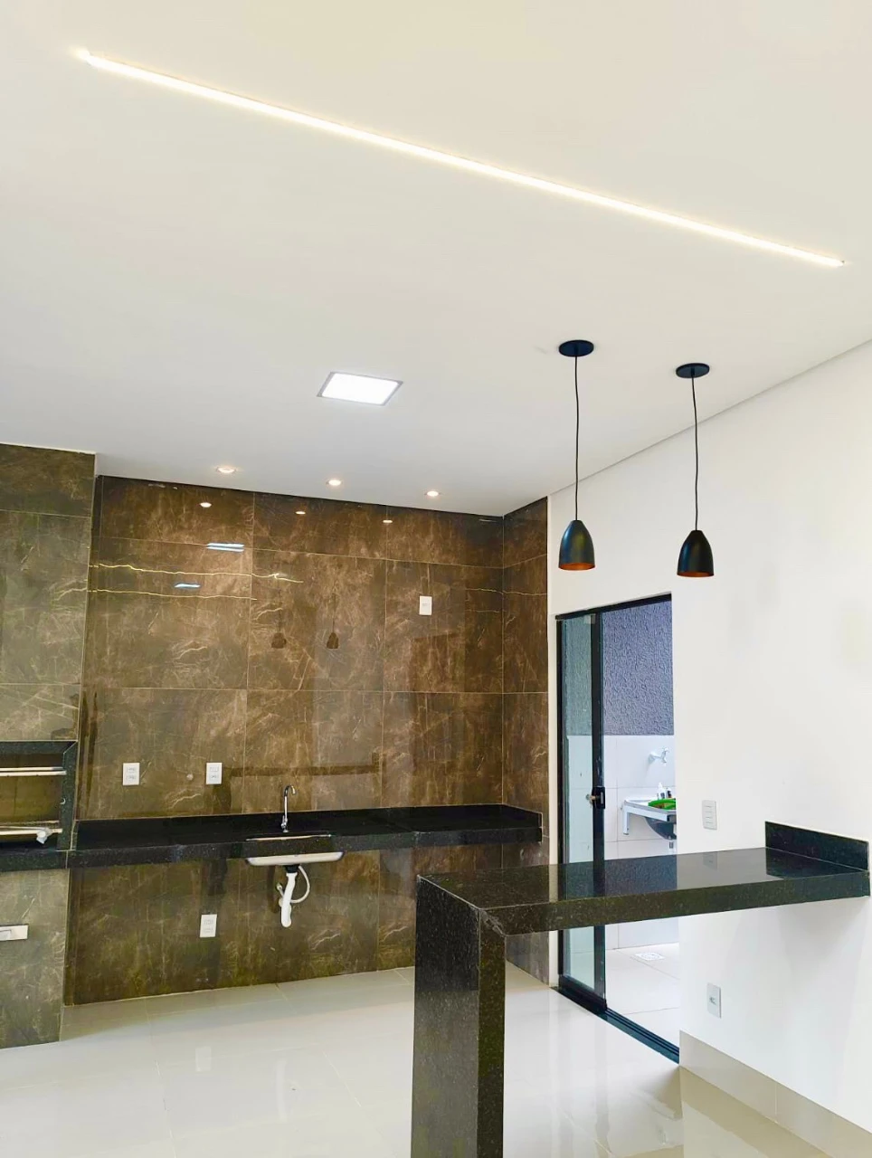 - Diferenciais: Área gourmet com churrasqueira, todas as bancadas em granito, teto rebaixado com iluminação embutida