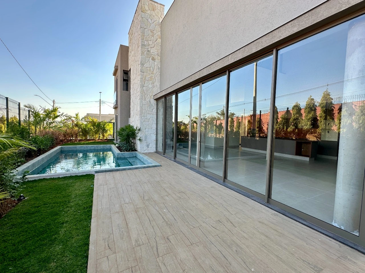 Área de lazer com piscina aquecida, hidromassagem, deck e paisagismo completo