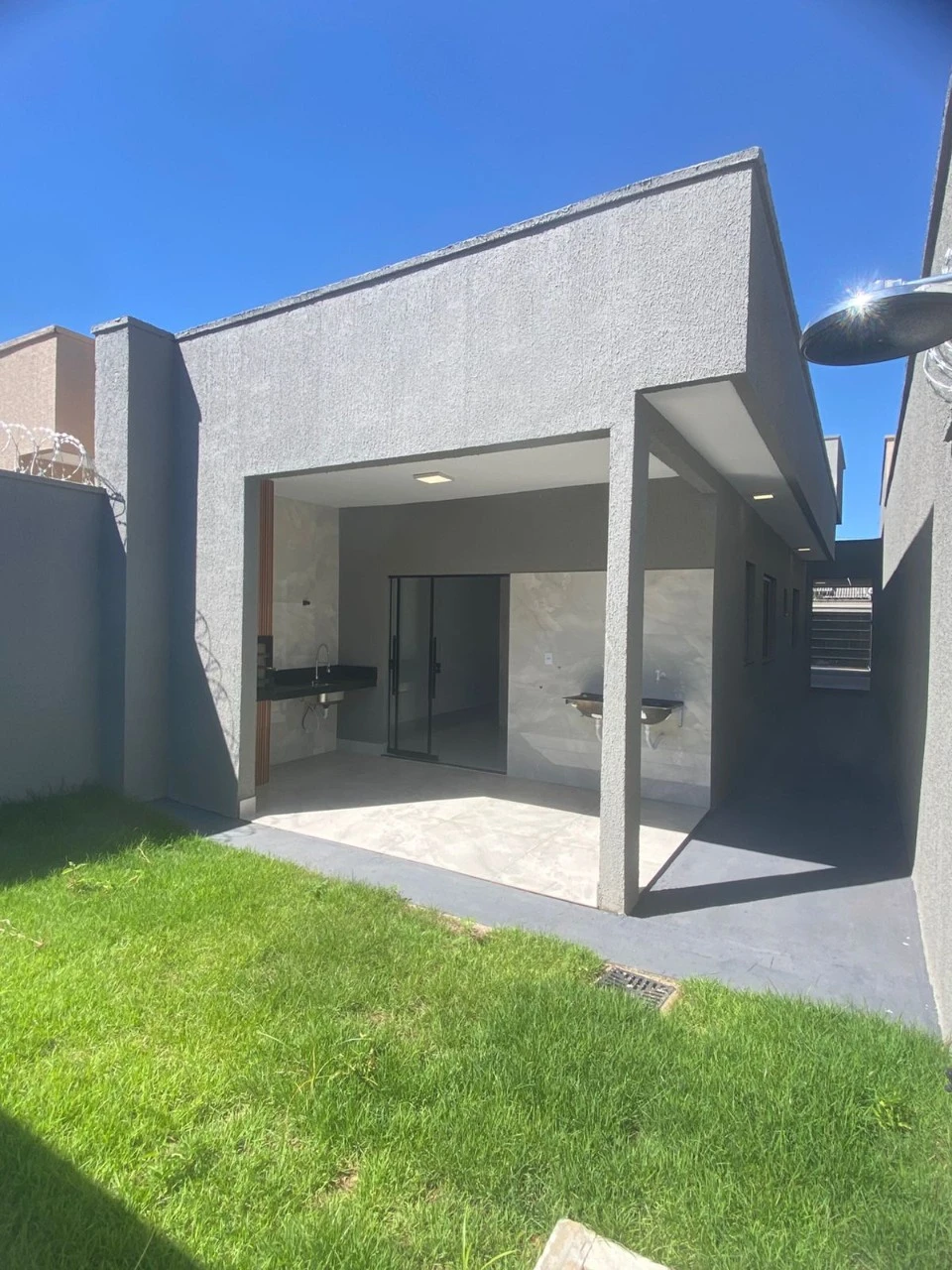- 3 Quartos sendo 1 suite - Fachada Revestida em pedra e com fita de led - Sala pé direito duplo, detalhe em Cristal, fita de led e curtineiro iluminado - Janelas alta na sala e suite - Suíte com pé direito duplo - Área total 181,00 m2 - Área construída 102,03 m2 - fita de led na garagem, sala e fachada - Bancadas em pedra preto São Gabriel - Cerca e concertina industrial - Ducha revestida - Pintura interna acetinada - Ponto para ar condicionado em todos os quartos com encanação para dreno e fiação com disjuntores individuais no quadro elétrico - Área Gourmet com bancada preto São Gabriel escovado e churrasqueira revestida em porcelanato - Nicho nos banheiros - R$ 393.000,00