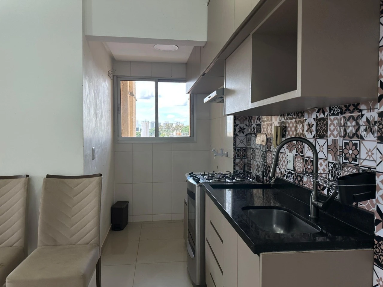 Apartamento completo em armários na cozinha, guarda roupa nos quartos, com um belo sol da manha.